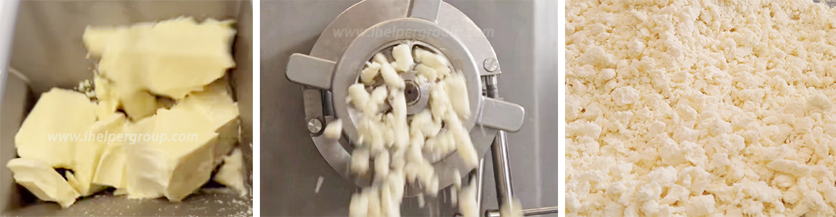The industrial cheese grater machine directly grinds the frozen(-18°C) cheese block . The temperature of the cheese does not raise much, which is good for keeping the product fresh.